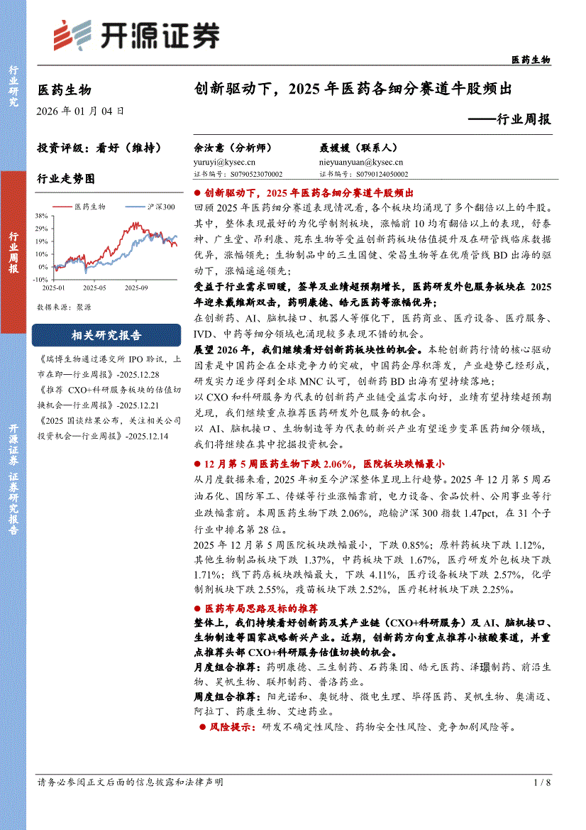 医药生物行业:开源证券-医药生物行业周报:创新驱动下,2025年医药各细分赛道牛股频出-260104