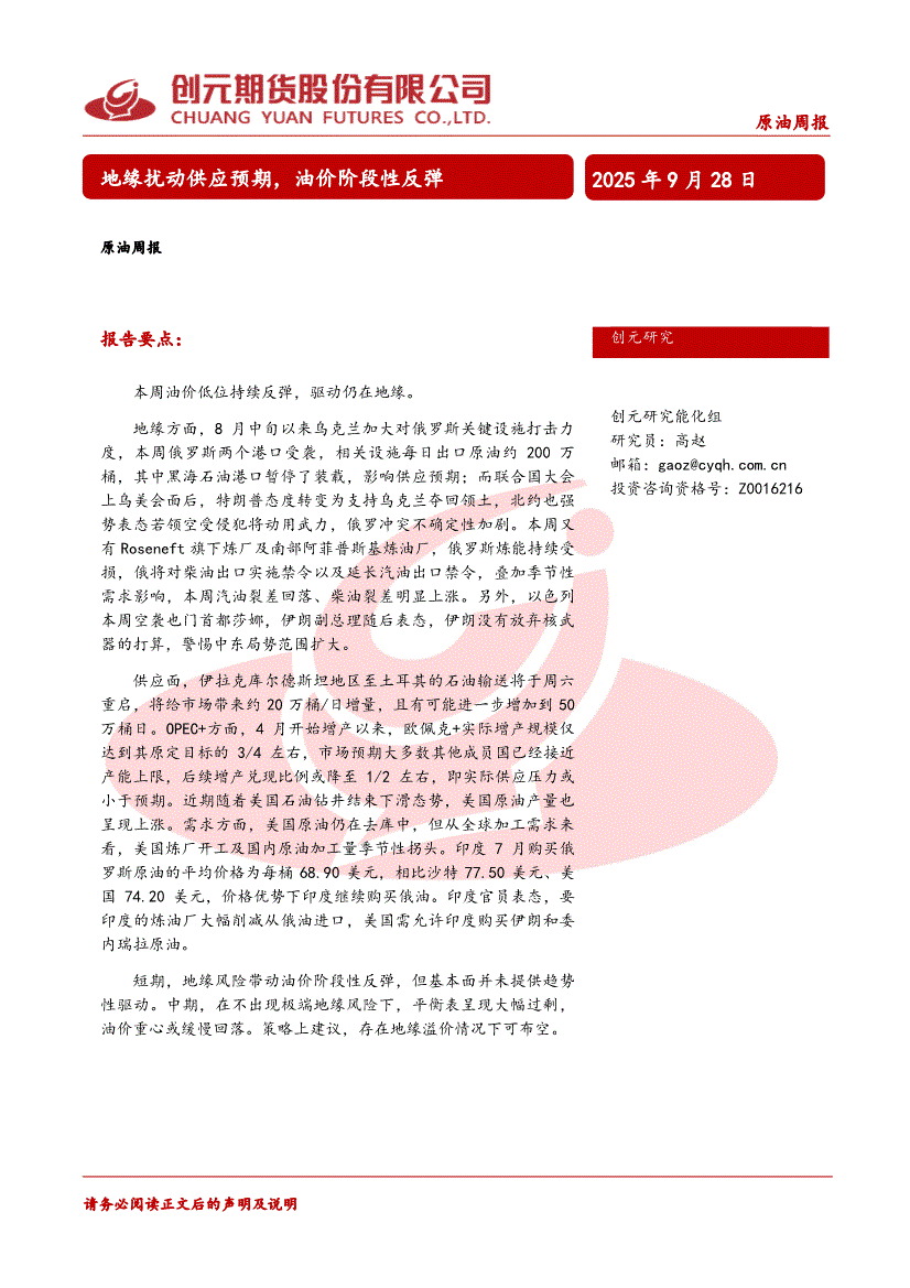 创元期货-原油周报:地缘扰动供应预期,油价阶段性反弹-250928