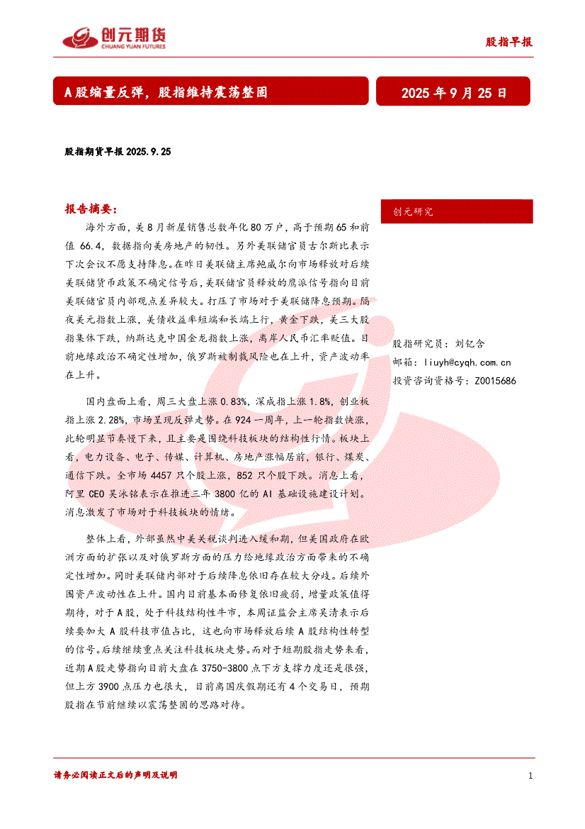 创元期货-股指早报:美经济数据韧性打压降息预期,A股科技结构性行情-250926