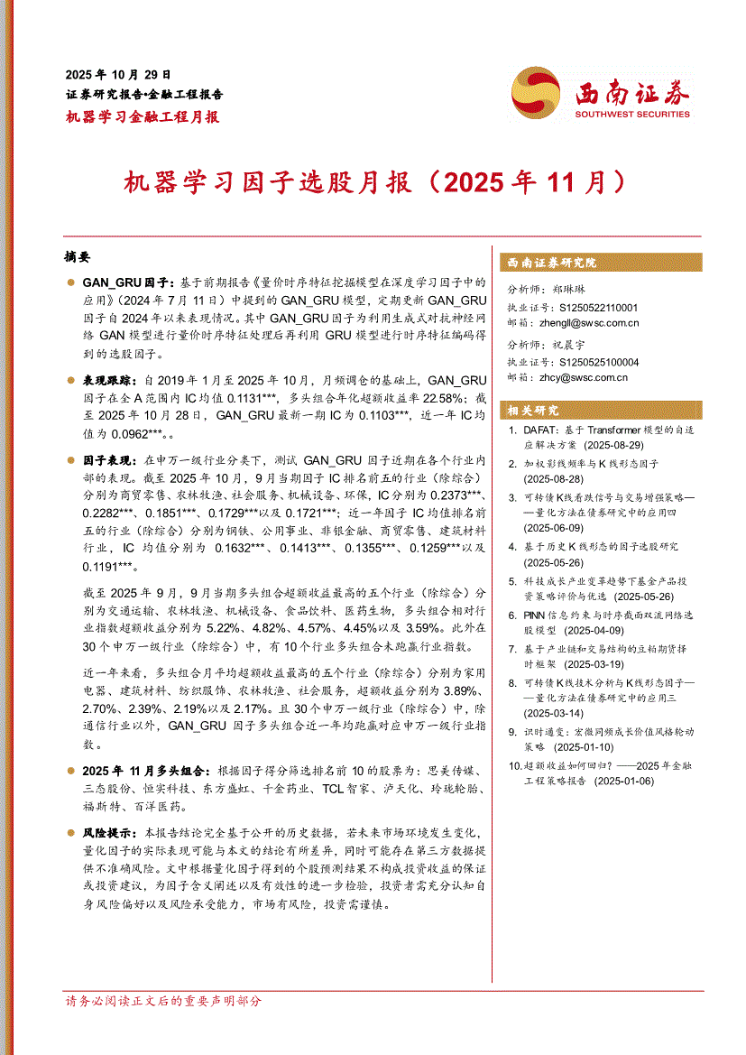西南证券-机器学习金融工程月报:机器学习因子选股月报(2025年11月)-251029