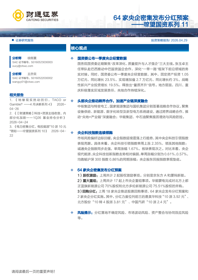 财通证券-瞭望国资系列11:64家央企密集发布分红预案-260429