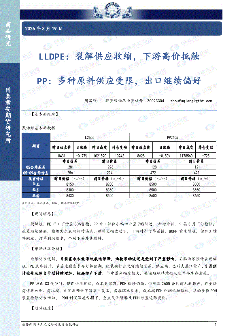 国泰君安期货-LLDPE:裂解供应收缩,下游高价抵触,PP,多种原料供应受限,出口继续偏好-260319
