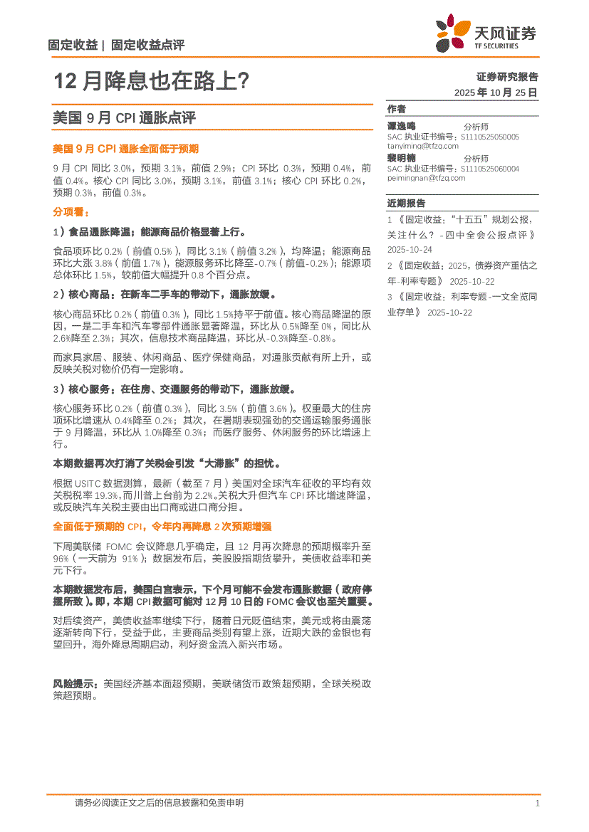 天风证券-美国9月CPI通胀点评:12月降息也在路上?-251025