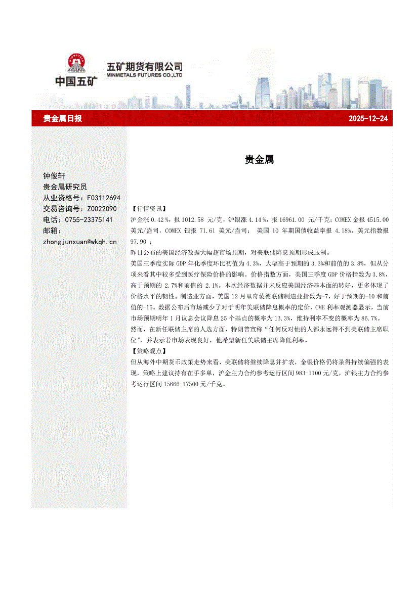 五矿期货-贵金属周报:注意价格剧烈波动风险-251213