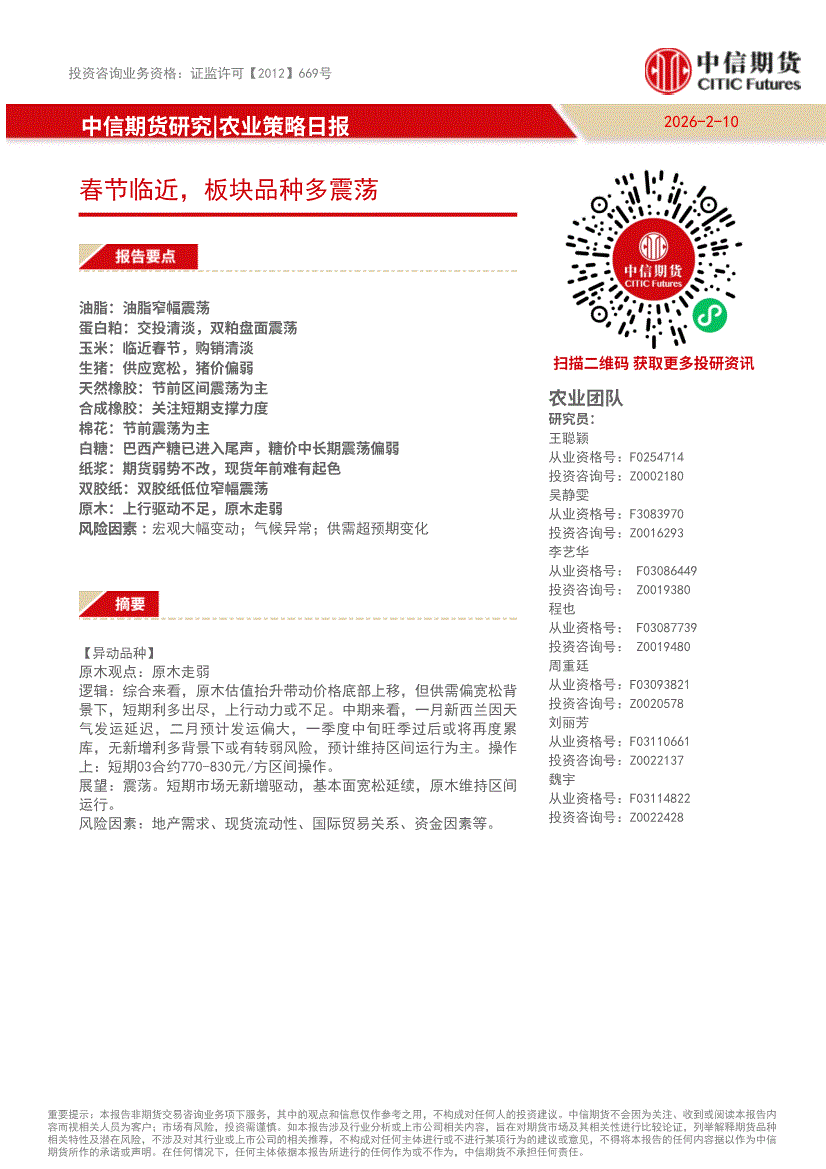 中信期货-农业策略日报:春节临近,板块品种多震荡-260210
