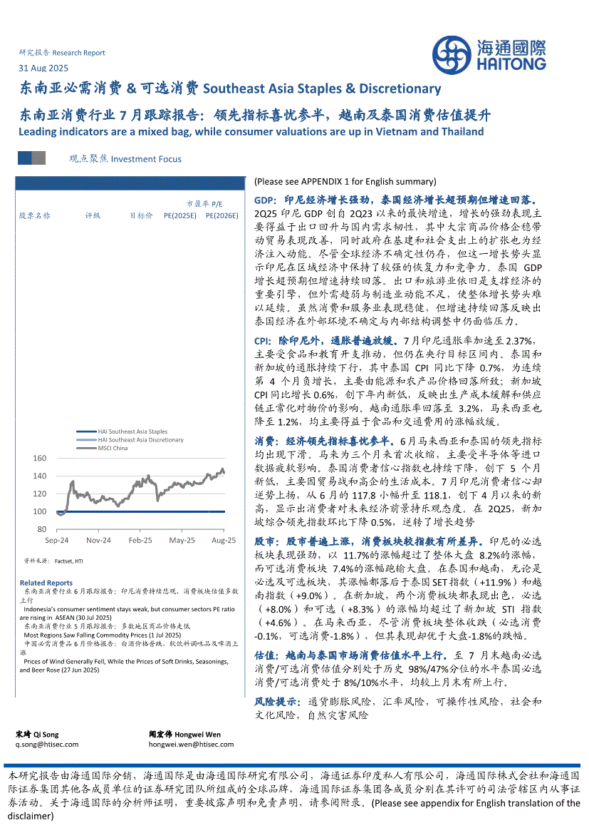 消费行业:海通国际-东南亚消费行业7月跟踪报告:领先指标喜忧参半,越南及泰国消费估值提升-250831