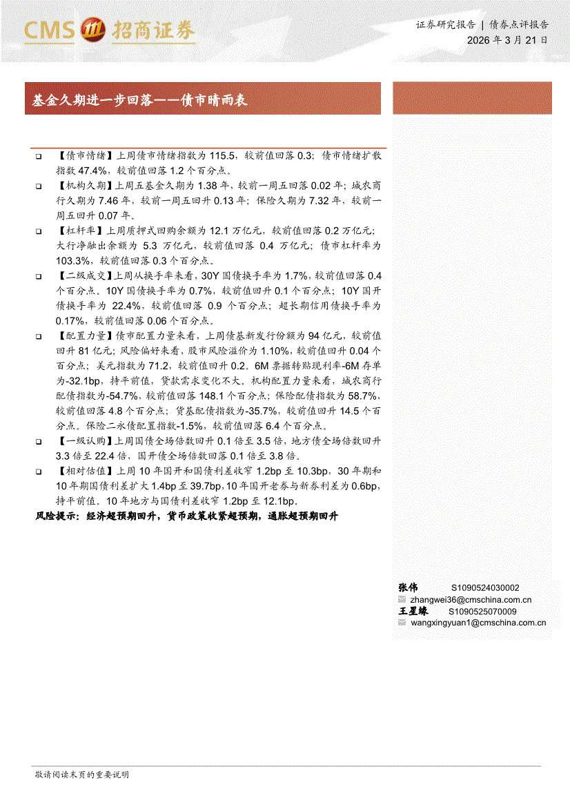 招商证券-债市晴雨表:基金久期进一步回落-260321