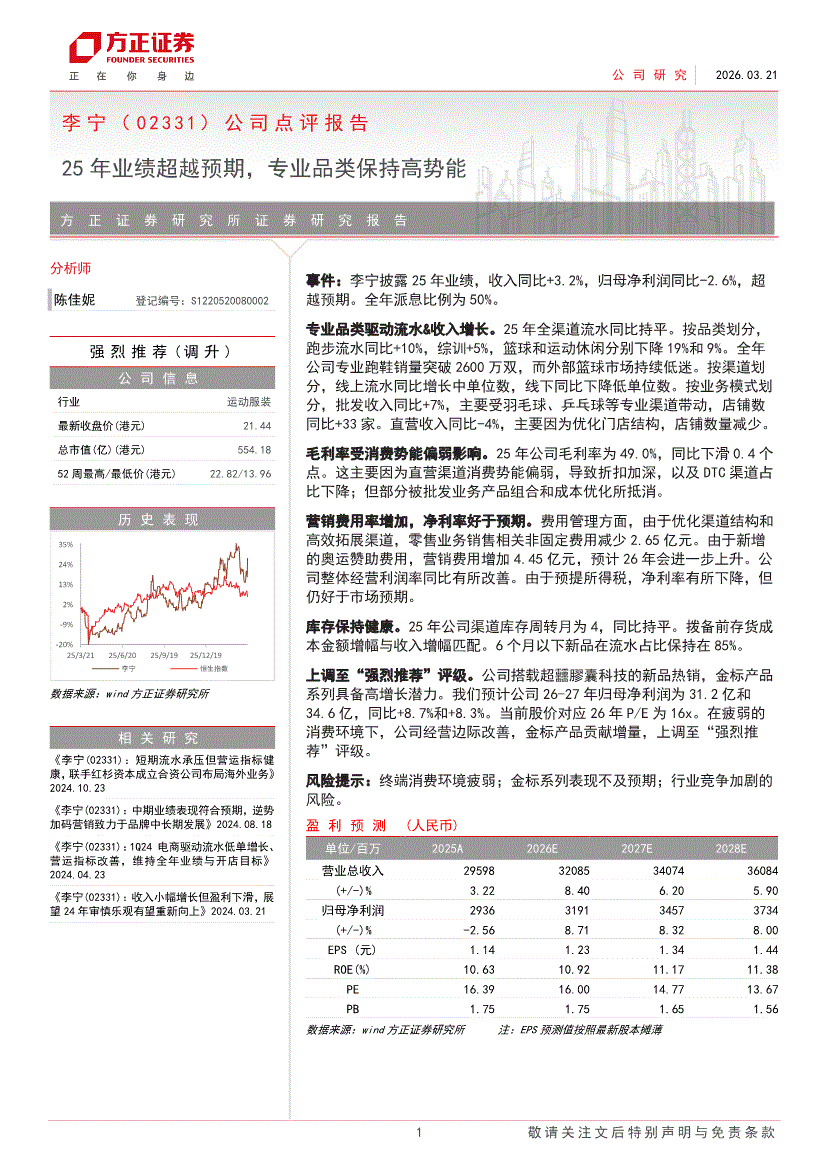 李宁:方正证券-李宁-2331.HK-公司点评报告:25年业绩超越预期,专业品类保持高势能-260321