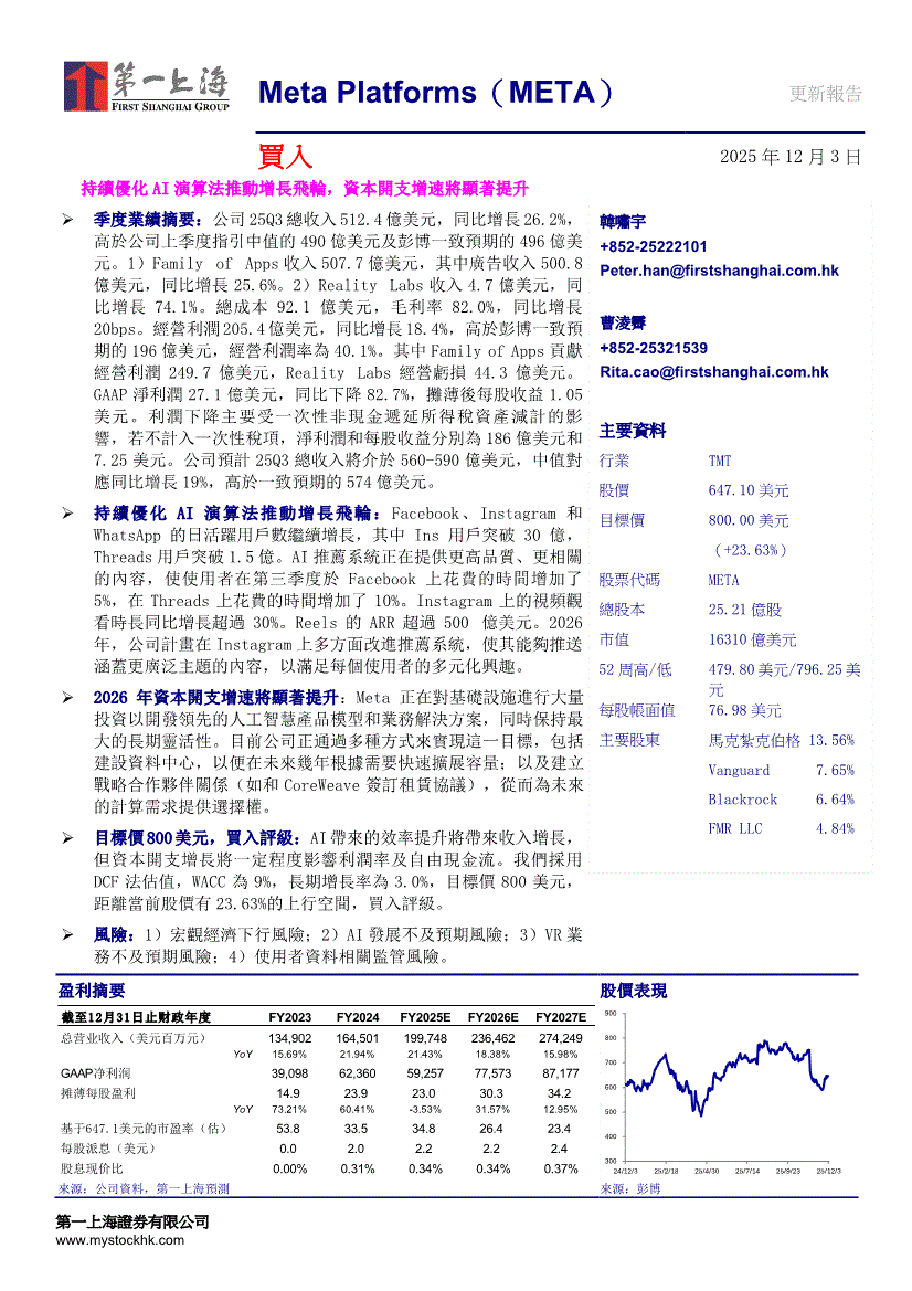 Meta Platforms:第一上海-Meta Platforms-META.US-持续优化AI演算法推动增长飞轮,资本开支增速将显著提升-251203