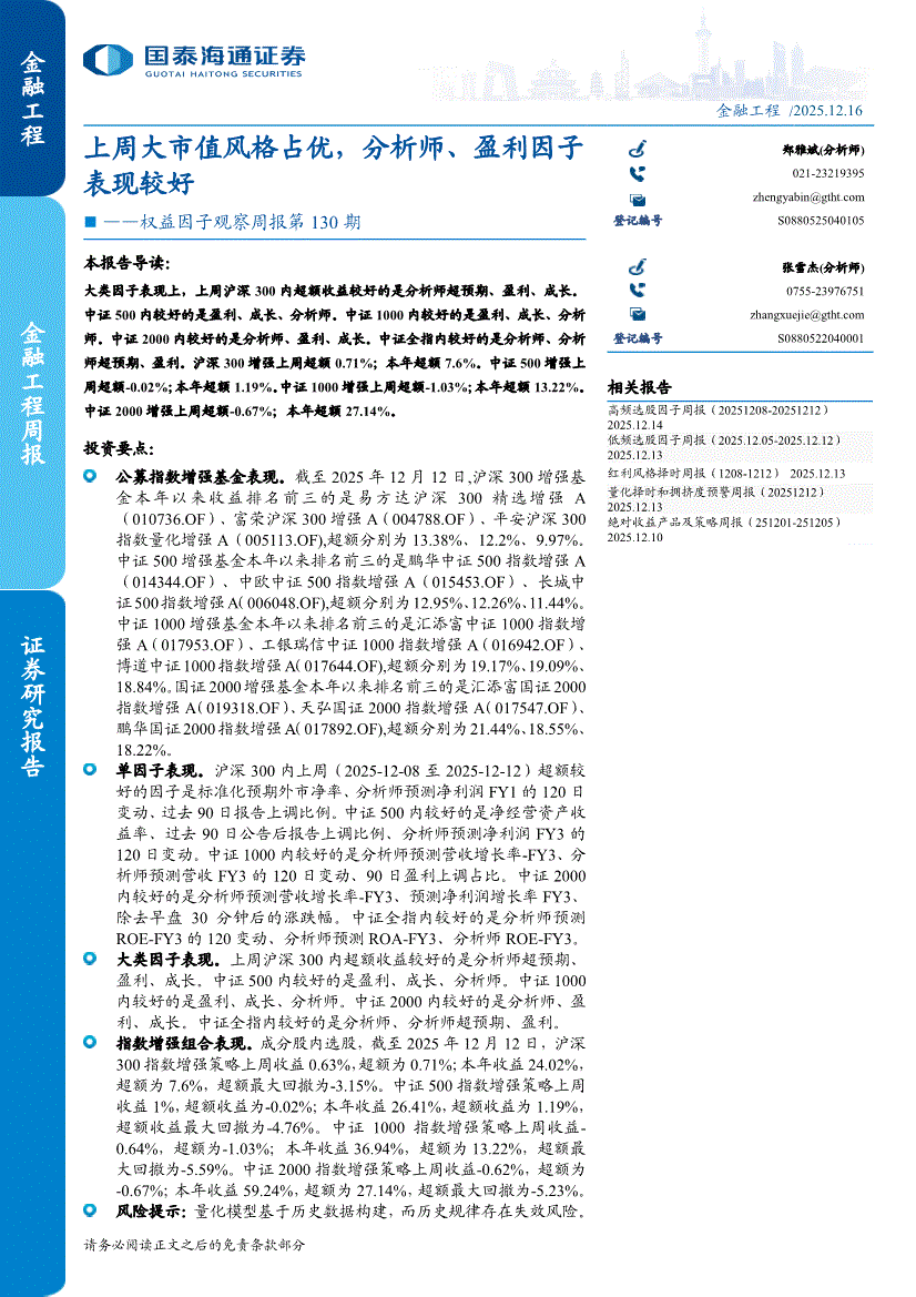 国泰海通证券-权益因子观察周报第130期:上周大市值风格占优,分析师、盈利因子表现较好-251216