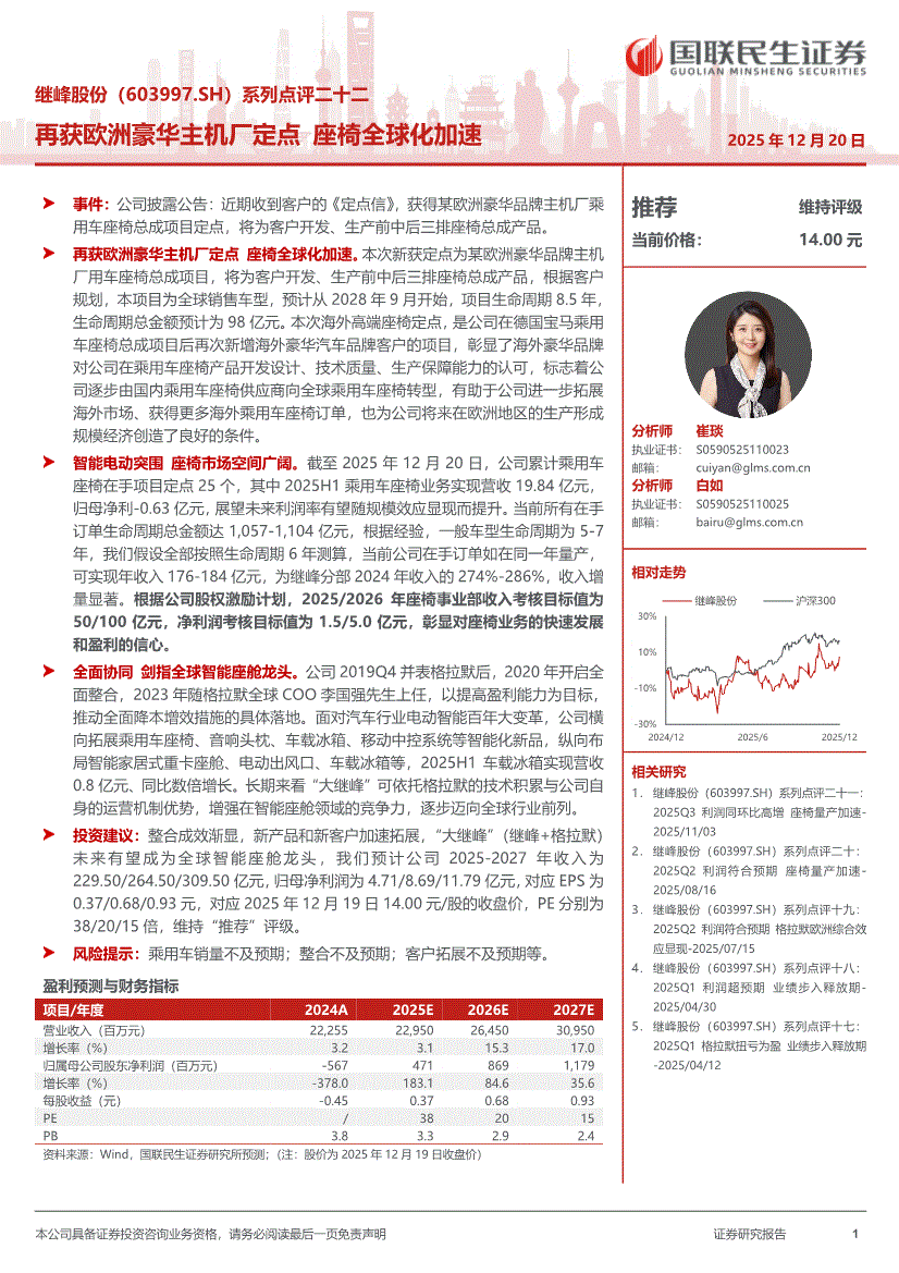 继峰股份:国联民生证券-继峰股份-603997-系列点评二十二:再获欧洲豪华主机厂定点,座椅全球化加速-251220
