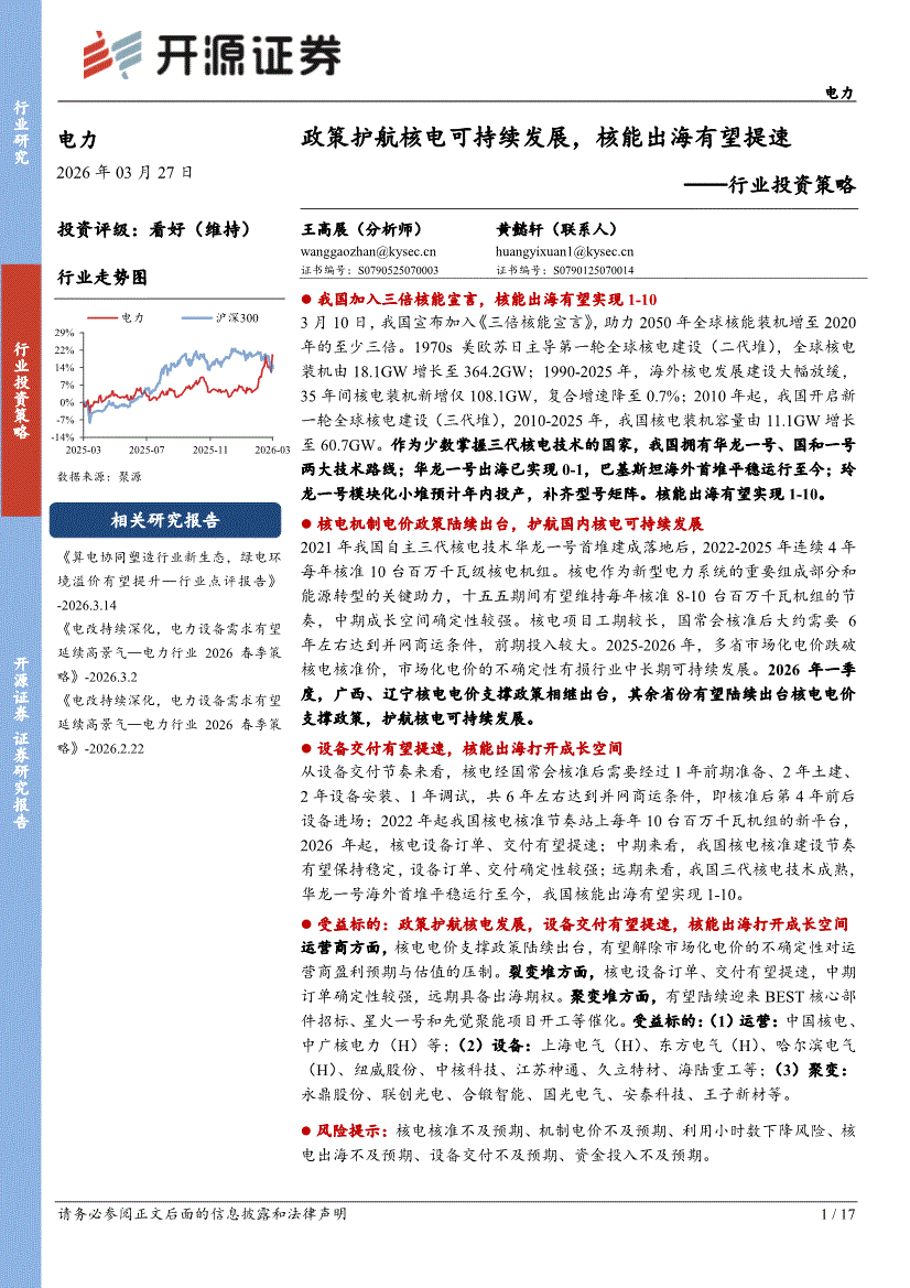 电力行业:开源证券-电力行业投资策略:政策护航核电可持续发展,核能出海有望提速-260327