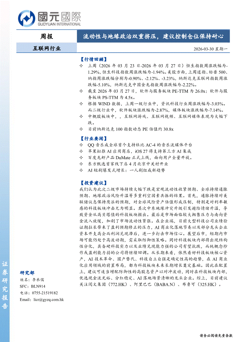 互联网行业:国元国际-互联网行业周报:流动性与地缘政治双重挤压,建议控制仓位保持耐心-260330