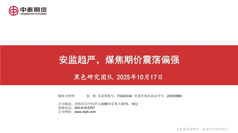 中泰期货-安监趋严,煤焦期价震荡偏强-251017
