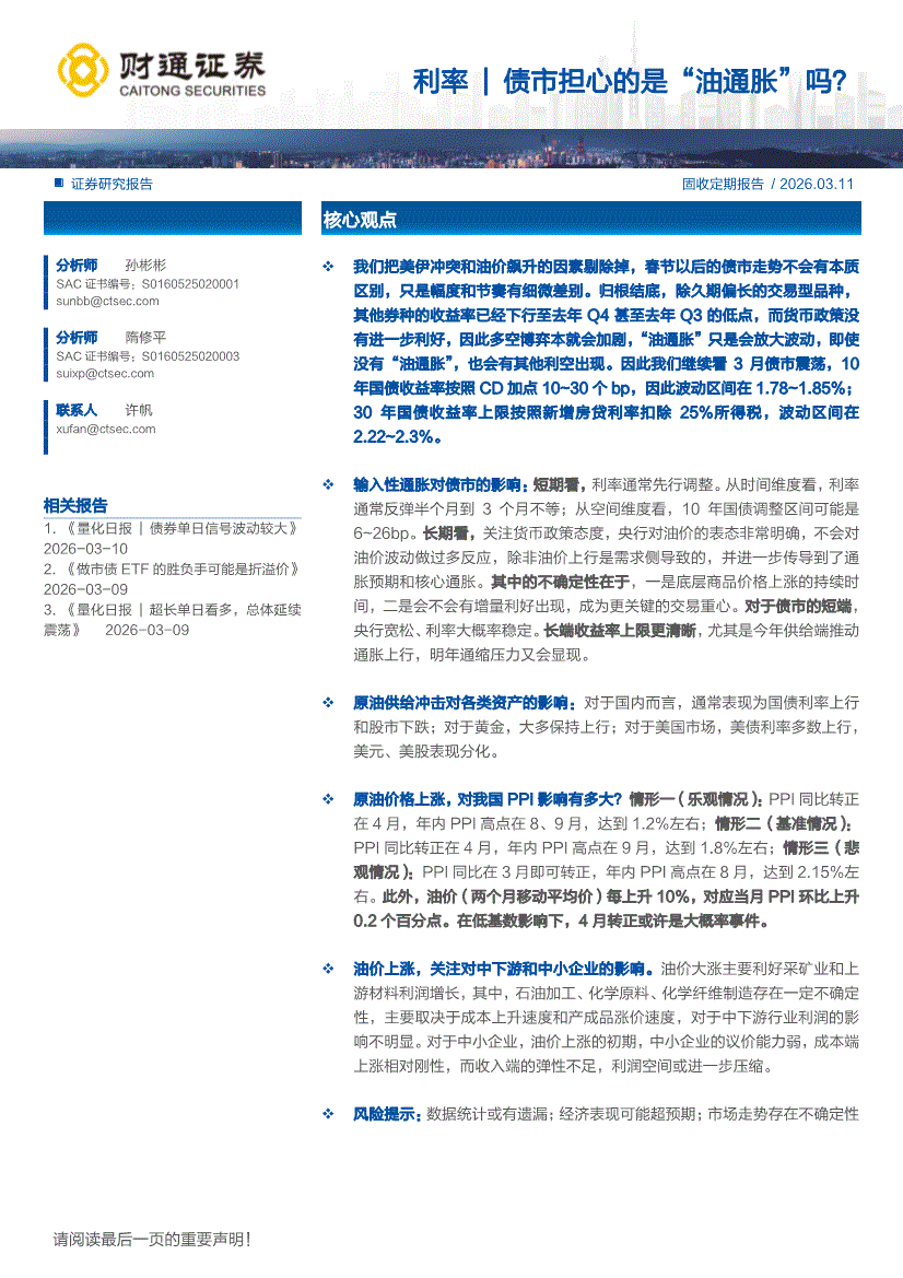 财通证券-利率|债市担心的是“油通胀”吗?-260311