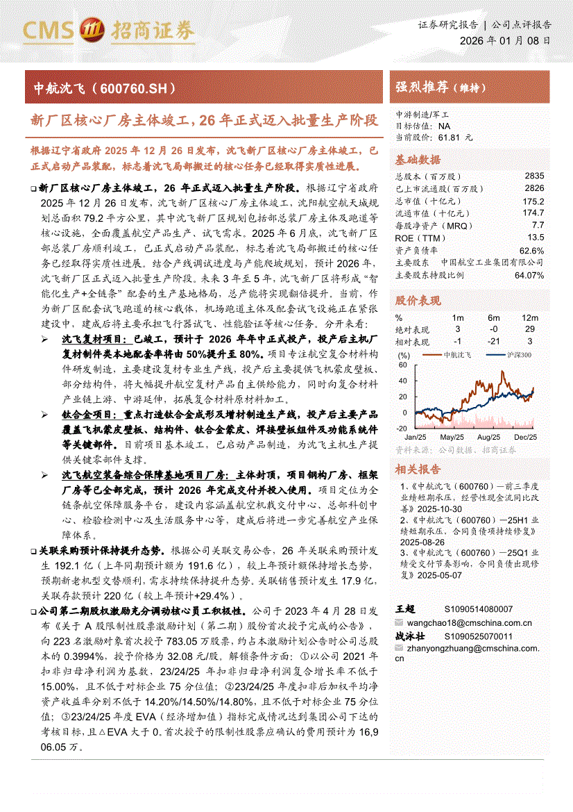 中航沈飞:招商证券-中航沈飞-600760-新厂区核心厂房主体竣工,26年正式迈入批量生产阶段-260108