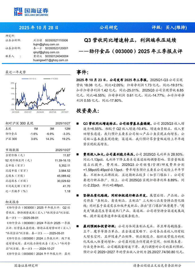 劲仔食品:国海证券-劲仔食品-003000-2025年三季报点评:Q3营收同比增速转正,利润端承压延续-251028