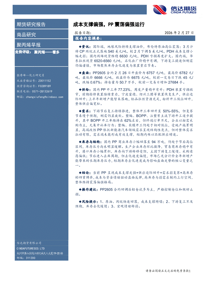 信达期货-聚丙烯早报:成本支撑偏强,PP震荡偏强运行-260227