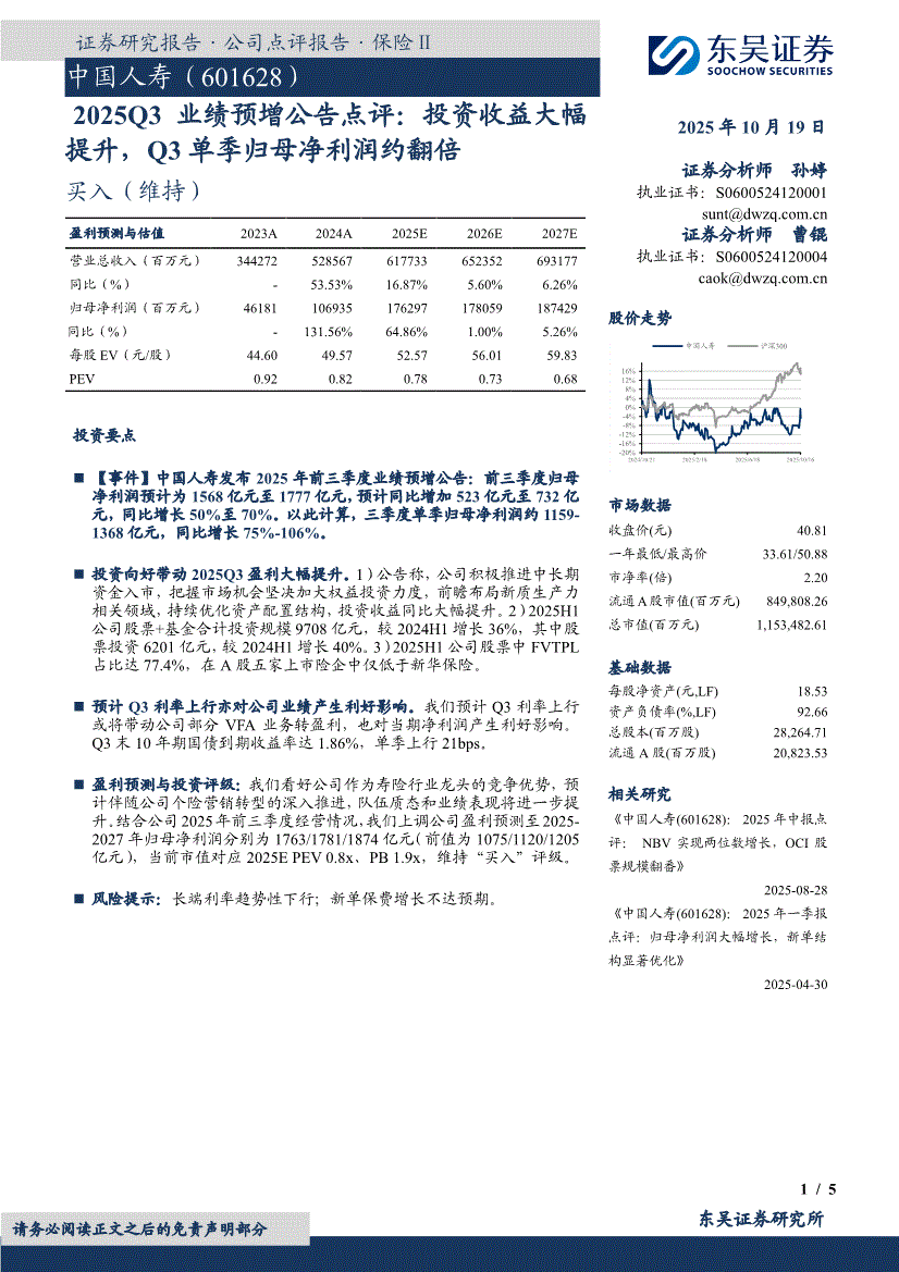 中国人寿:东吴证券-中国人寿-601628-2025Q3业绩预增公告点评:投资收益大幅提升,Q3单季归母净利润约翻倍-251019