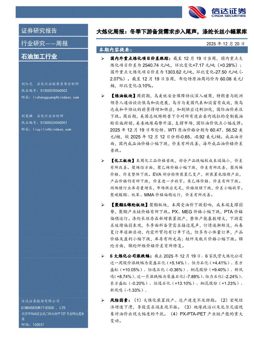 石油加工行业:信达证券-石油加工行业大炼化周报:冬季下游备货需求步入尾声,涤纶长丝小幅累库-251220
