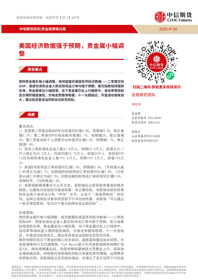 中信期货-贵金属策略日报:美国经济数据强于预期,贵金属小幅调整-250926