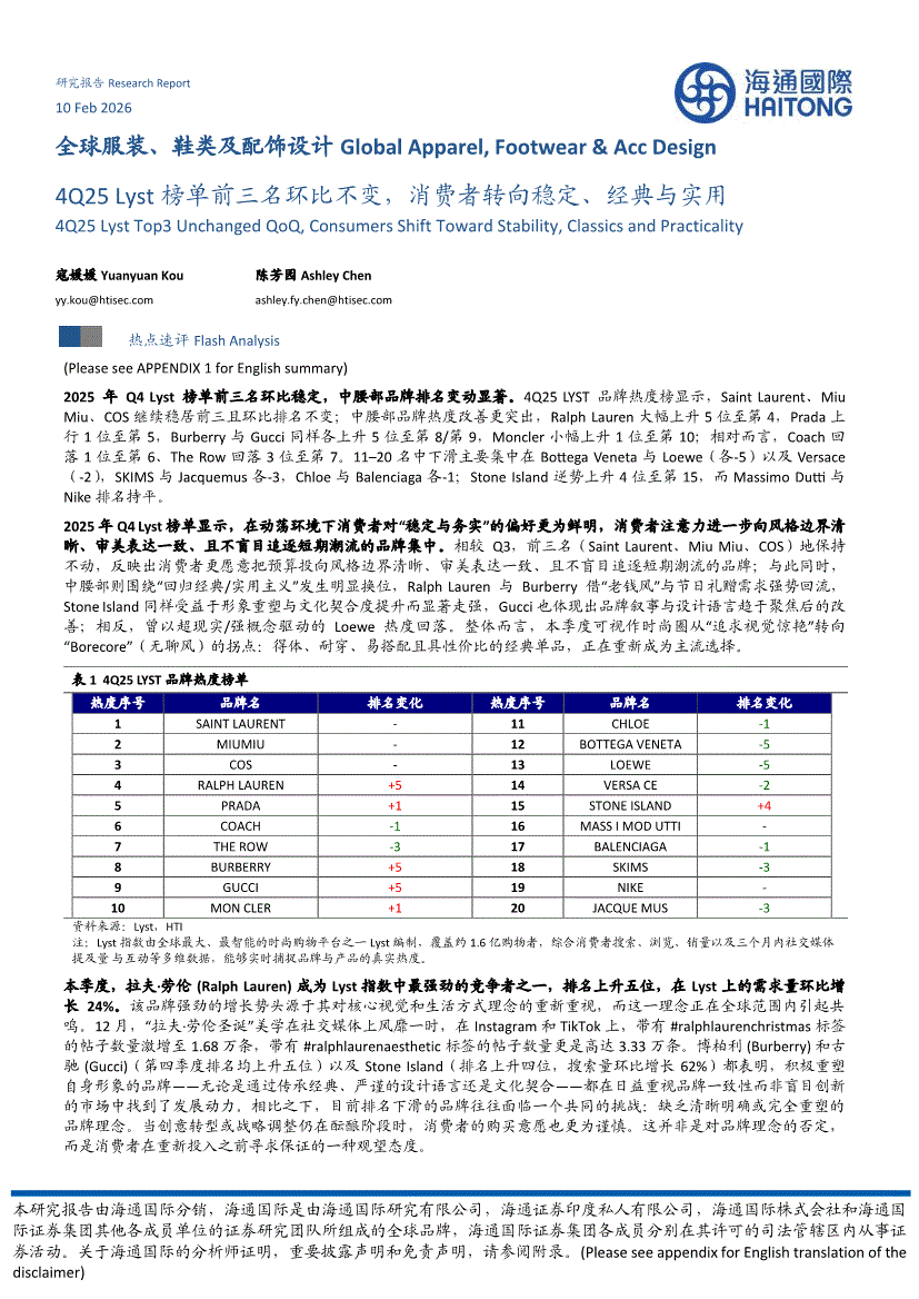 服装、鞋类及配饰设计行业:海通国际-全球服装、鞋类及配饰设计行业:4Q25 Lyst榜单前三名环比不变,消费者转向稳定、经典与实用-260210