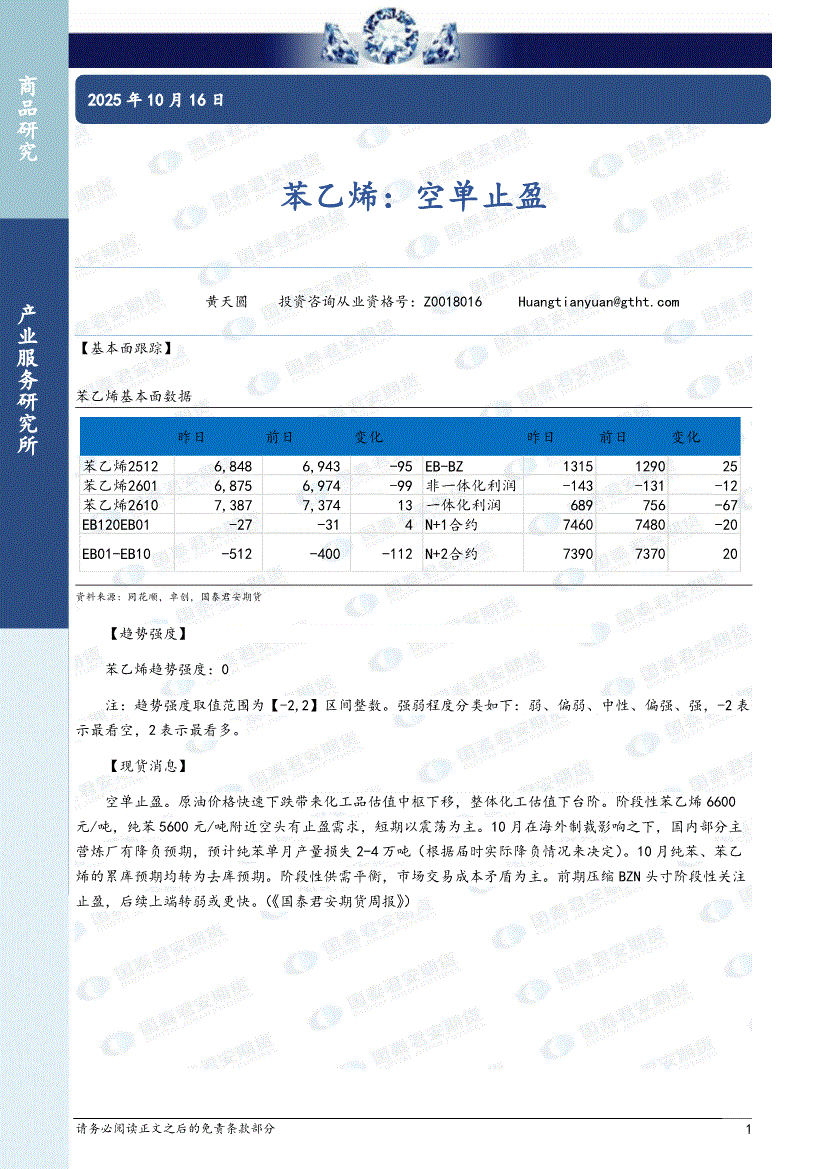 国泰君安期货-纯苯、苯乙烯周报-251019