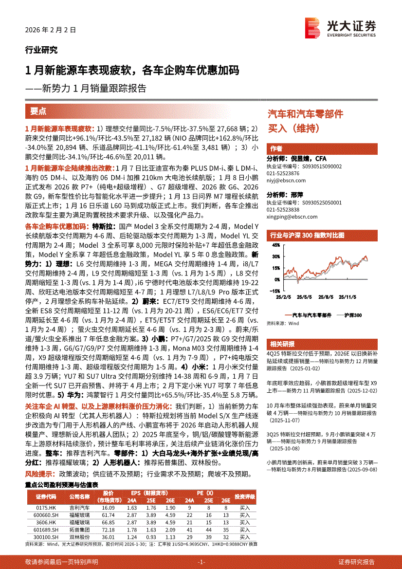 汽车和汽车零部件行业:光大证券-汽车和汽车零部件行业新势力1月销量跟踪报告:1月新能源车表现疲软,各车企购车优惠加码-260202