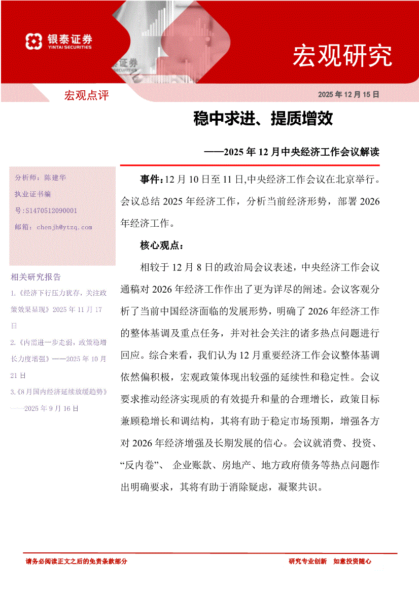 银泰证券-2025年12月中央经济工作会议解读:稳中求进、提质增效-251215