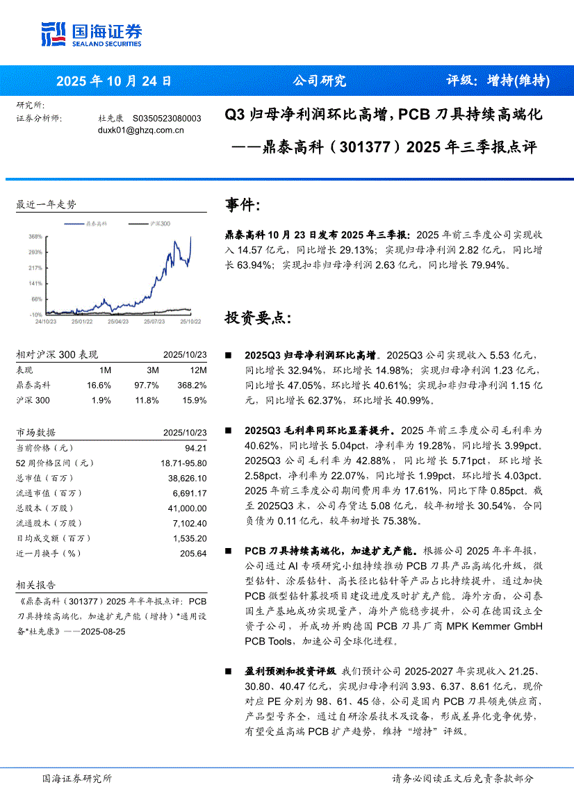 鼎泰高科:国海证券-鼎泰高科-301377-2025年三季报点评:Q3归母净利润环比高增,PCB刀具持续高端化-251024