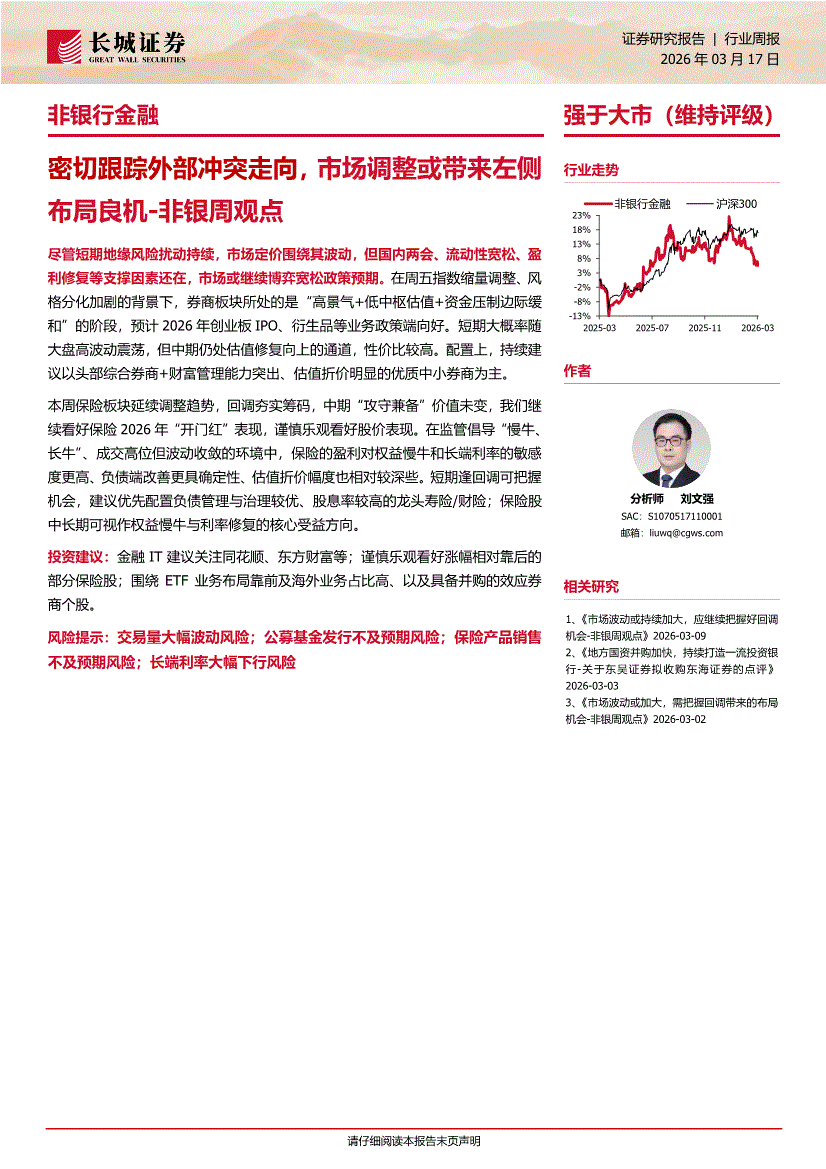 非银行金融行业:长城证券-非银行金融行业周观点:密切跟踪外部冲突走向,市场调整或带来左侧布局良机-260317