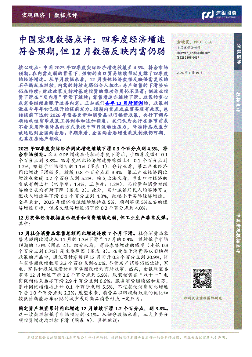 浦银国际-中国宏观数据点评:四季度经济增速符合预期,但12月数据反映内需仍弱-260119