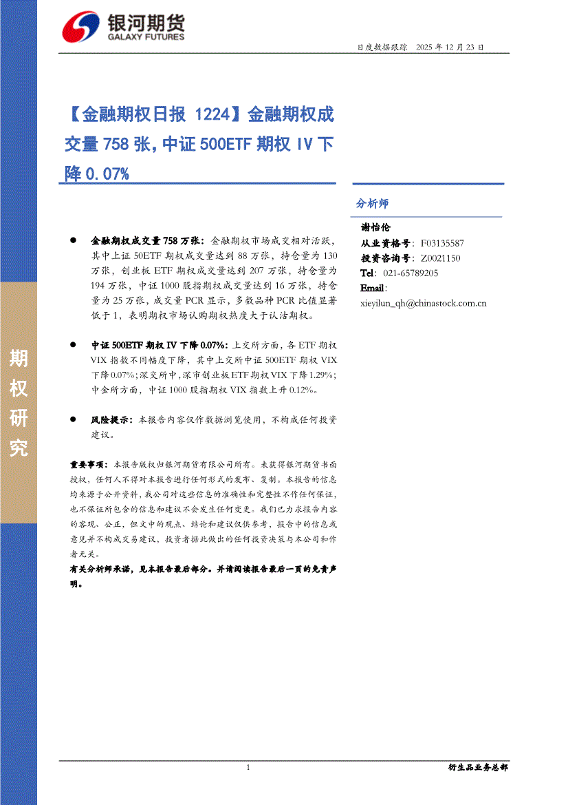 银河期货-【金融期权日报】金融期权成交量758张,中证500ETF期权IV下降0.07%-251223