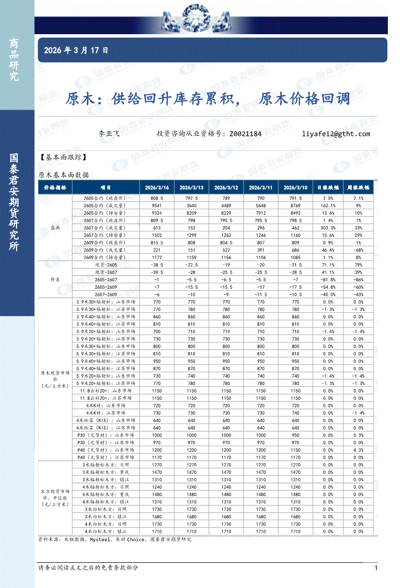 国泰君安期货-原木:供给回升库存累积,原木价格回调-260317