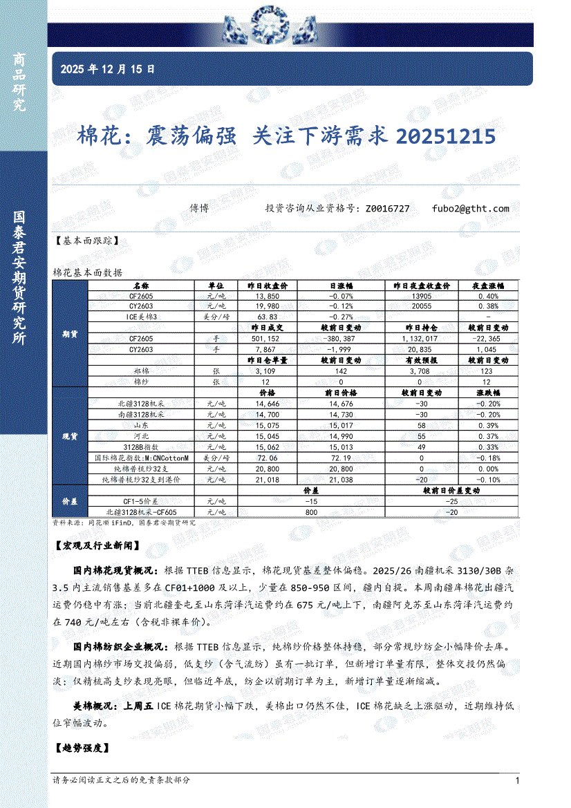 国泰君安期货-棉花:震荡偏强,关注下游需求-251212