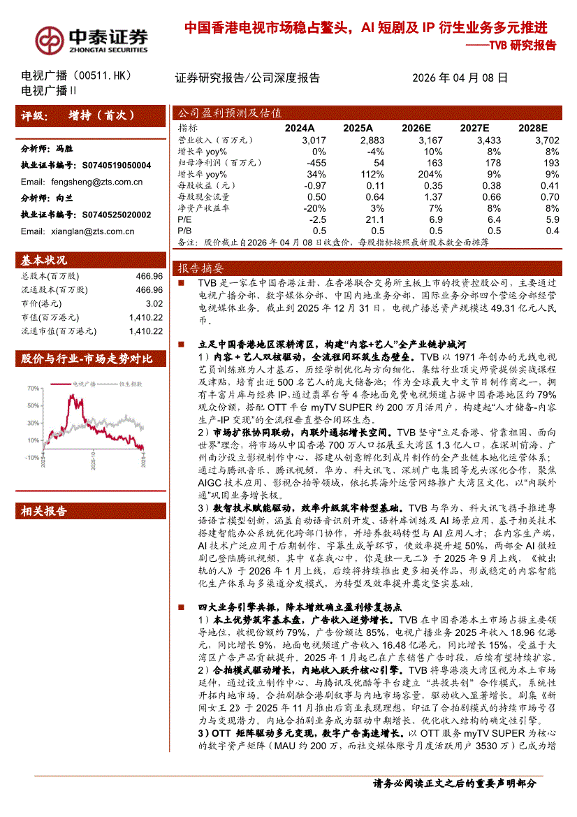 电视广播:中泰证券-电视广播-0511.HK-TVB研究报告:中国香港电视市场稳占鳌头,AI短剧及IP衍生业务多元推进-260408