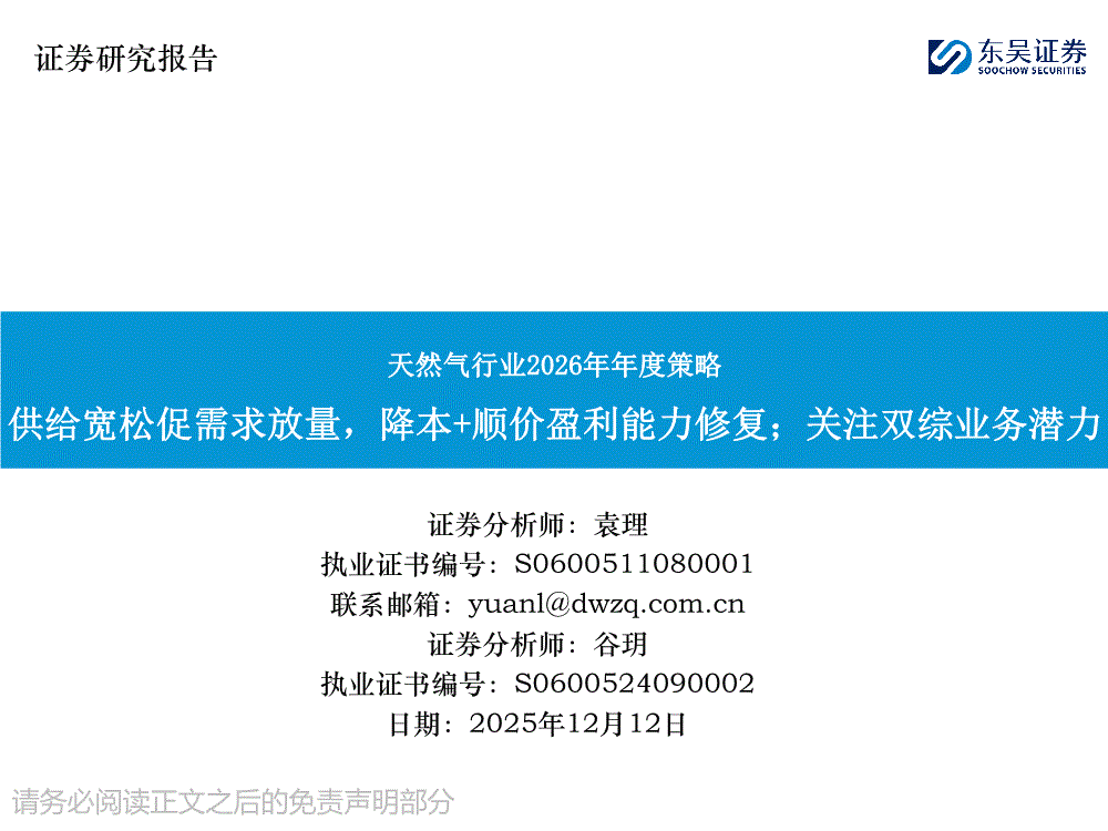 天然气行业:东吴证券-天然气行业2026年年度策略:供给宽松促需求放量,降本+顺价盈利能力修复;关注双综业务潜力-251212