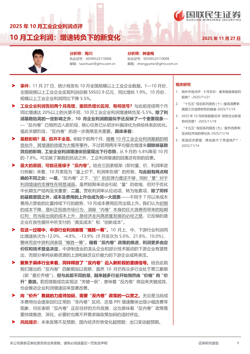 国联民生证券-2025年10月工业企业利润点评:10月工企利润,增速转负下的新变化-251127