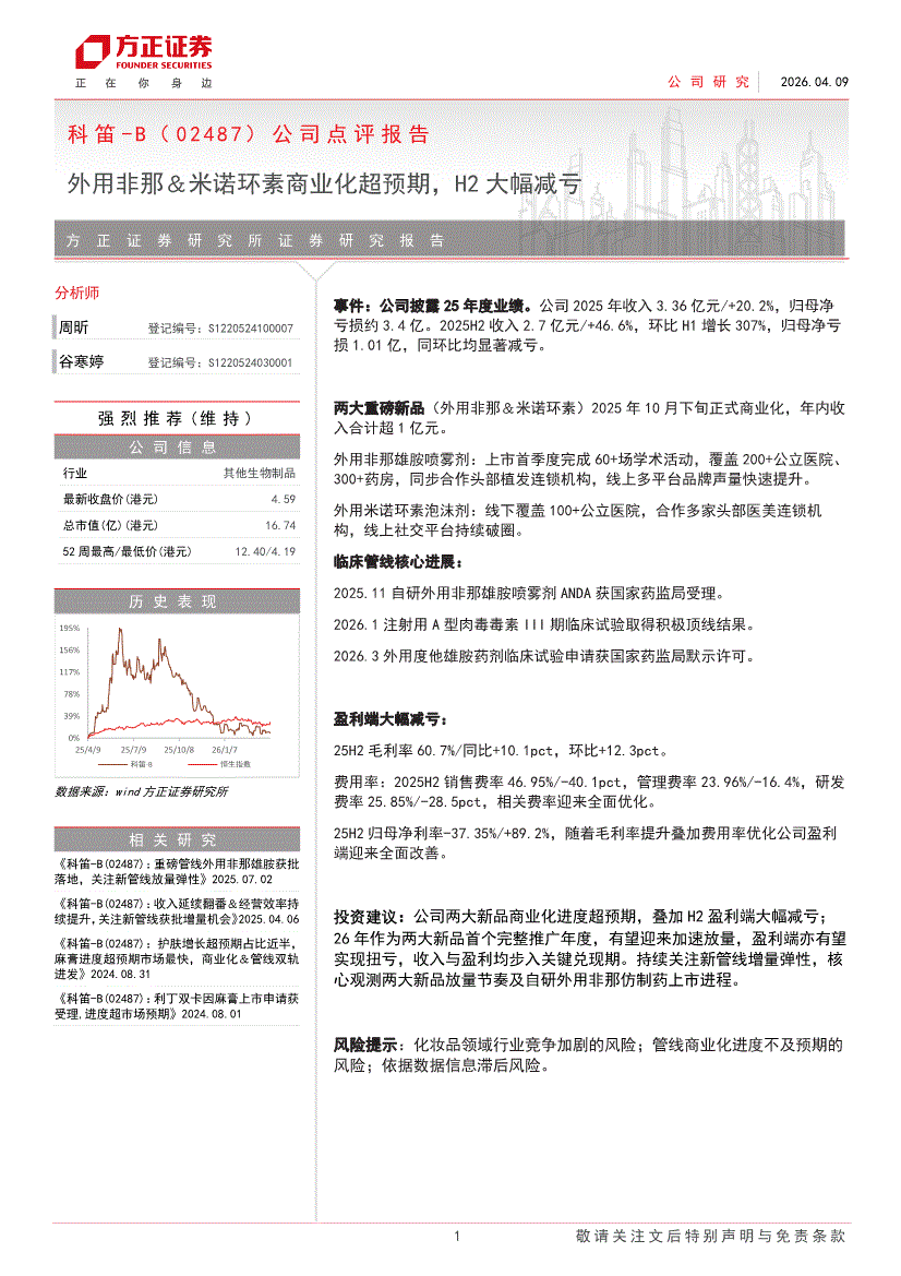 科笛~B:方正证券-科笛~B-2487.HK-公司点评报告:外用非那&米诺环素商业化超预期,H2大幅减亏-260409