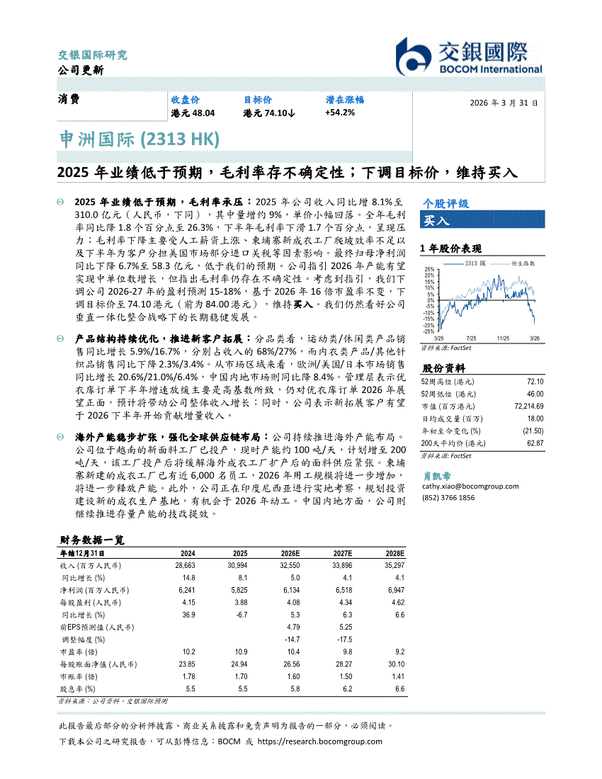 申洲国际:交银国际-申洲国际-2313.HK-2025年业绩低于预期,毛利率存不确定性;下调目标价,维持买入-260331