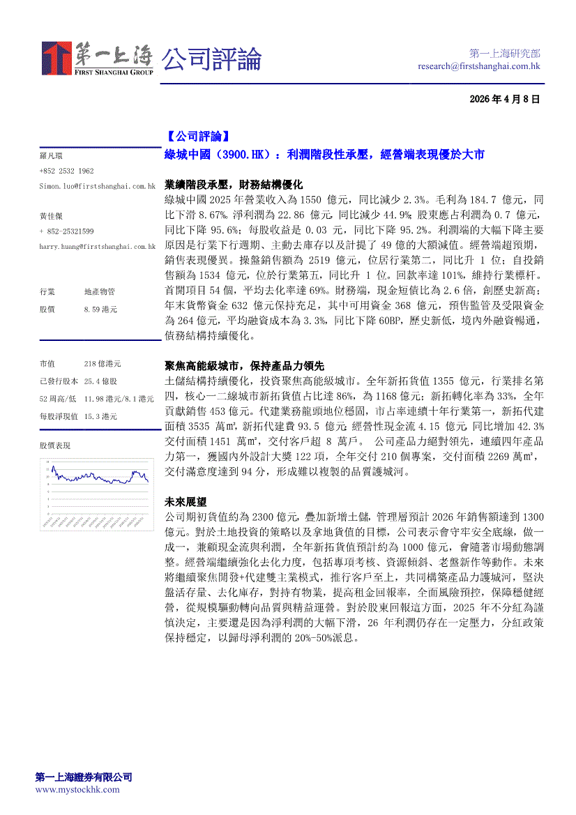绿城中国:第一上海-绿城中国-3900.HK-利润阶段性承压,经营端表现优于大市-260408