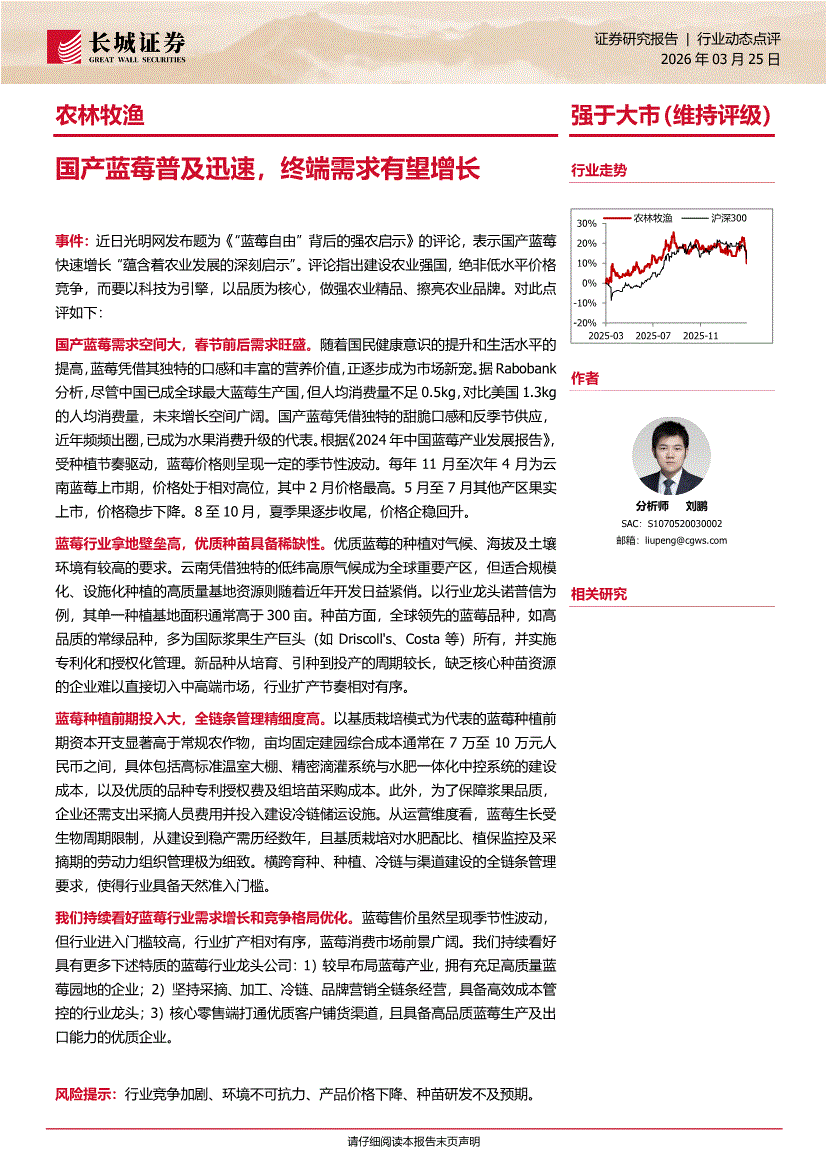 农林牧渔行业:长城证券-农林牧渔行业:国产蓝莓普及迅速,终端需求有望增长-260325