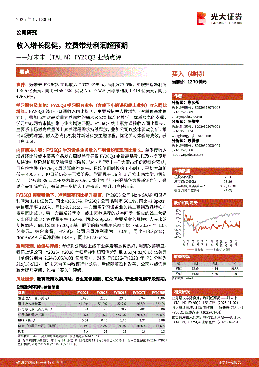 好未来:光大证券-好未来-TAL.US-FY26Q3业绩点评:收入增长稳健,控费带动利润超预期-260130