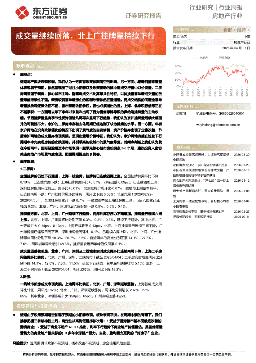 房地产行业:东方证券-房地产行业周报:成交量继续回落,北上广挂牌量持续下行-260407