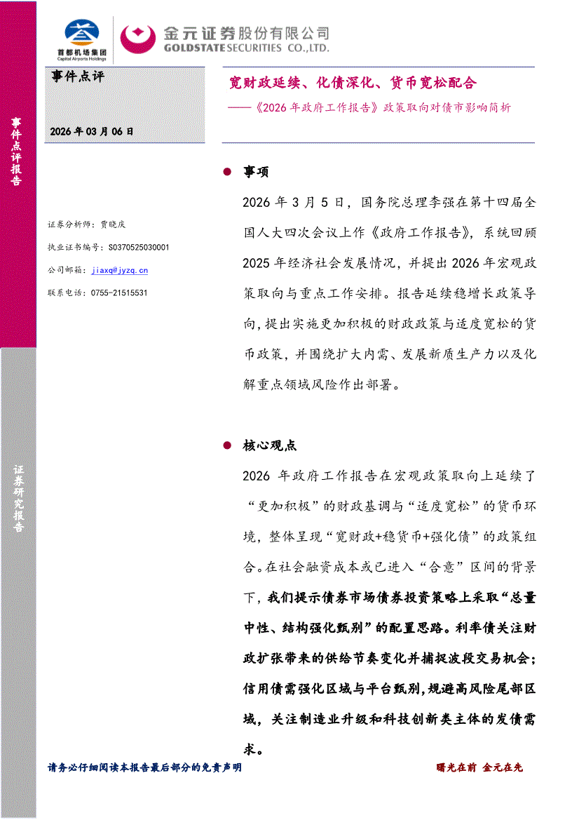 金元证券-《2026年政府工作报告》政策取向对债市影响简析:宽财政延续、化债深化、货币宽松配合-260306