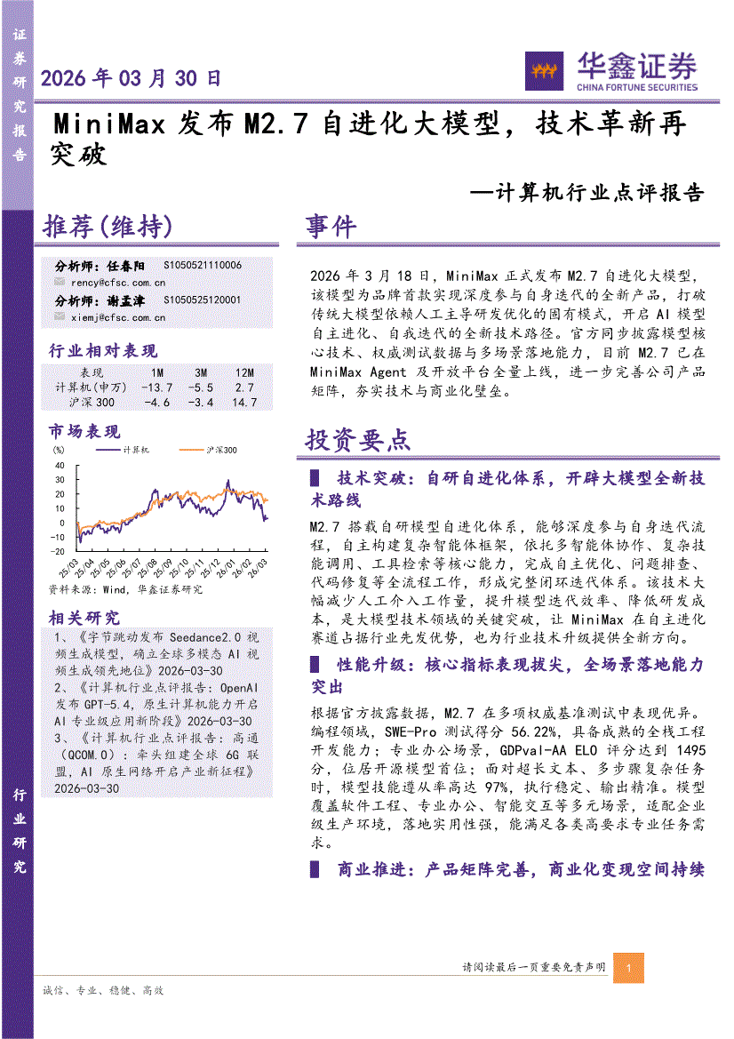 计算机行业:华鑫证券-计算机行业点评报告:MiniMax发布M2.7自进化大模型,技术革新再突破-260330