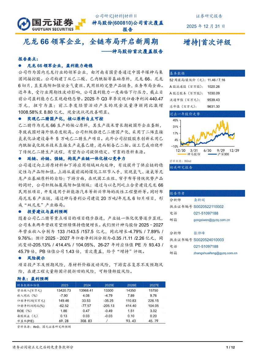 神马股份:国元证券-神马股份-600810-首次覆盖报告:尼龙66领军企业,全链布局开启新周期-251231