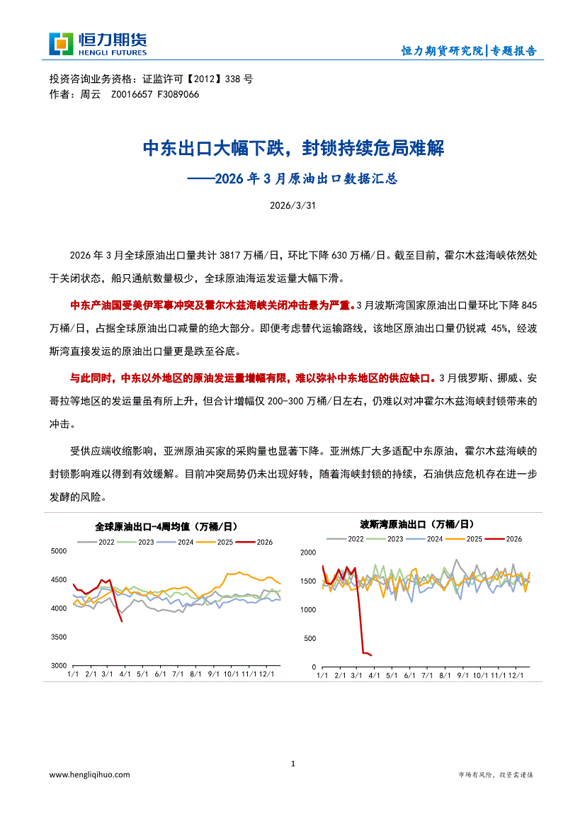 恒力期货-2026年3月原油出口数据汇总:中东出口大幅下跌,封锁持续危局难解-260331