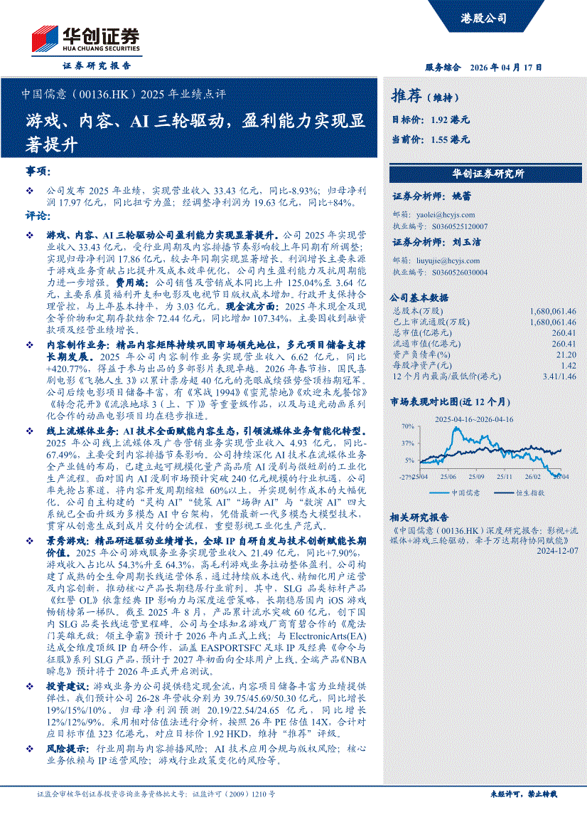 中国儒意:华创证券-中国儒意-0136.HK-2025年业绩点评:游戏、内容、AI三轮驱动,盈利能力实现显著提升-260417