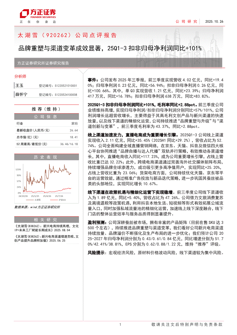 太湖雪:方正证券-太湖雪-920262-公司点评报告:品牌重塑与渠道变革成效显著,25Q1~3扣非归母净利润同比+101%-251026